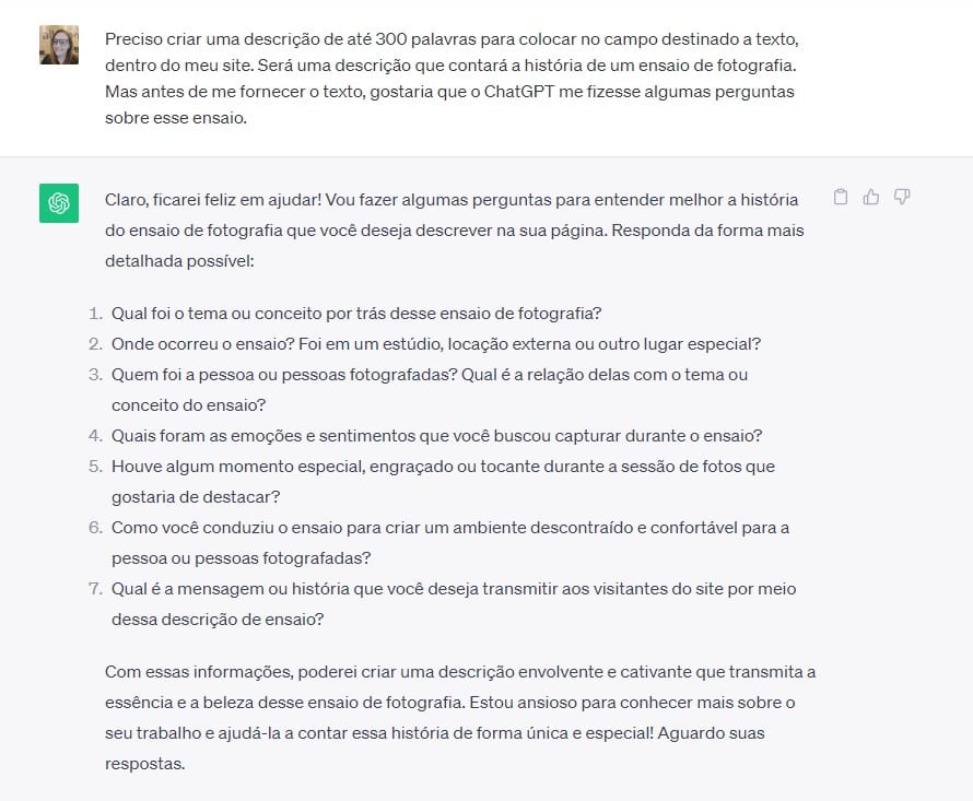 Uma oportunidade de usar o comando de criatividade é para criar descrições variadas para as imagens que você colocar no seu portfólio.